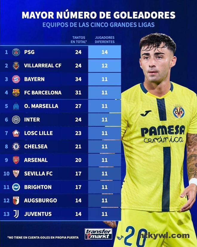 北京时间11月13日,德转统计出了本赛季至今欧洲五大联赛进球球员人数最多的13支球队,巴黎圣日耳曼14名球员在法甲破门排名第一,比利亚雷亚尔12人西甲破门第二,包括拜仁慕尼黑、巴塞罗那、国际米兰、切尔西、阿森纳以及尤文图斯在内的11支球队均有11名球员在联赛中破门并列第三。