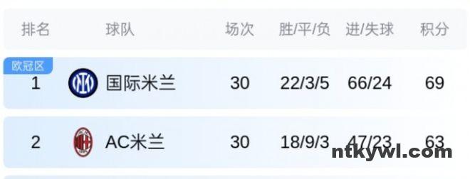 三轮联赛2平1负,仅拿到2分。与此同时,追赶者AC米兰近三轮2胜1负,抢下6分。两相对比,国米的领先优势从8分缩水至6分。