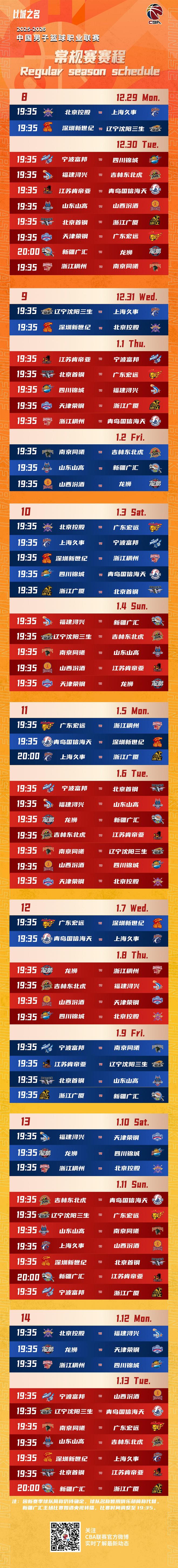 北京时间10月20日,CBA官方发布公告,宣布新赛季将于12月12日开赛,次年4月24日收官。 CBA2025-26赛季常规赛共42轮,揭幕战将于12月12日19:35开打,比赛为广厦主场迎战山西(上赛季常规赛前二)。 CBA新赛季常规赛赛程 芒果体育新闻中心 芒果体育-最权威热门的全球体育赛事直播平台新闻中心 杨瀚森两大队友提前续约!夏普4年9000万 卡马拉4年8200万 李月汝:由于目前伤病原因,我将不得不退出此次全运会的比赛