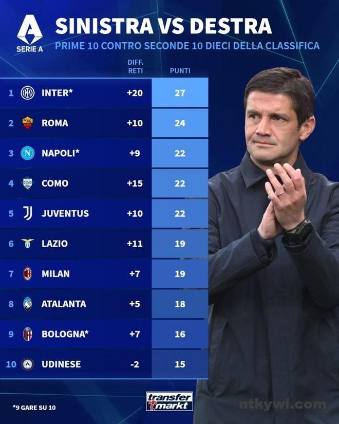 而净胜球数据也值得一提,国米以20粒净胜球遥遥领先,除了科莫的15球比较接近外,其他球队都只有国米的1/2、1/3甚至1/4。国米9场比赛就拿到20粒净胜球,场均净胜对手2.2球,证明蓝黑军团面对弱旅基本都能轻松取胜,印象里除了客战维罗纳是依靠对手压哨乌龙取胜之外,其他比赛中国米并没有遇到太大阻力。而那不勒斯、尤文、米兰等球队在对阵弱旅时不只是丢球丢分赢球困难,而且就算赢球也以小胜居多!