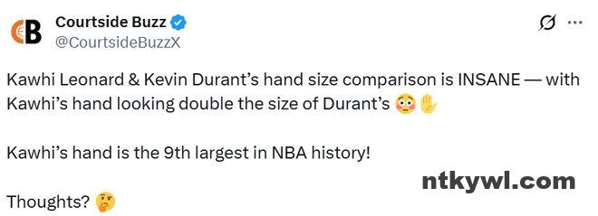 北京时间2月17日,美媒Courtside Buzz晒出了一张全明星赛的击掌图,并配文写道:“科怀-莱昂纳德和凯文-杜兰特的手掌大小对比简直太惊人了——科怀的手看起来是杜兰特手掌的两倍大。科怀的手是NBA历史上第九大的手!有什么想法?”